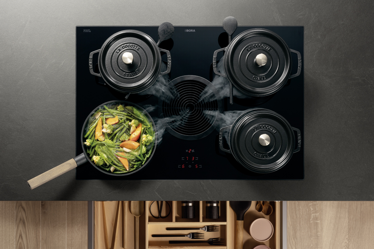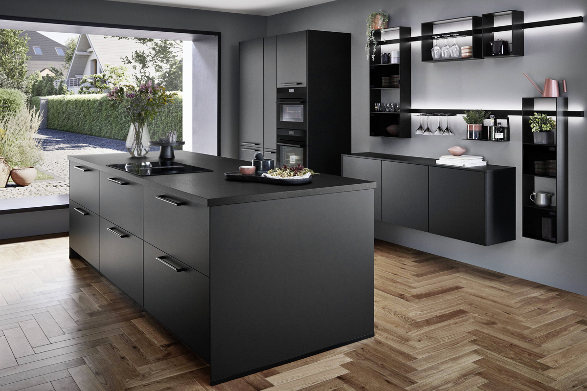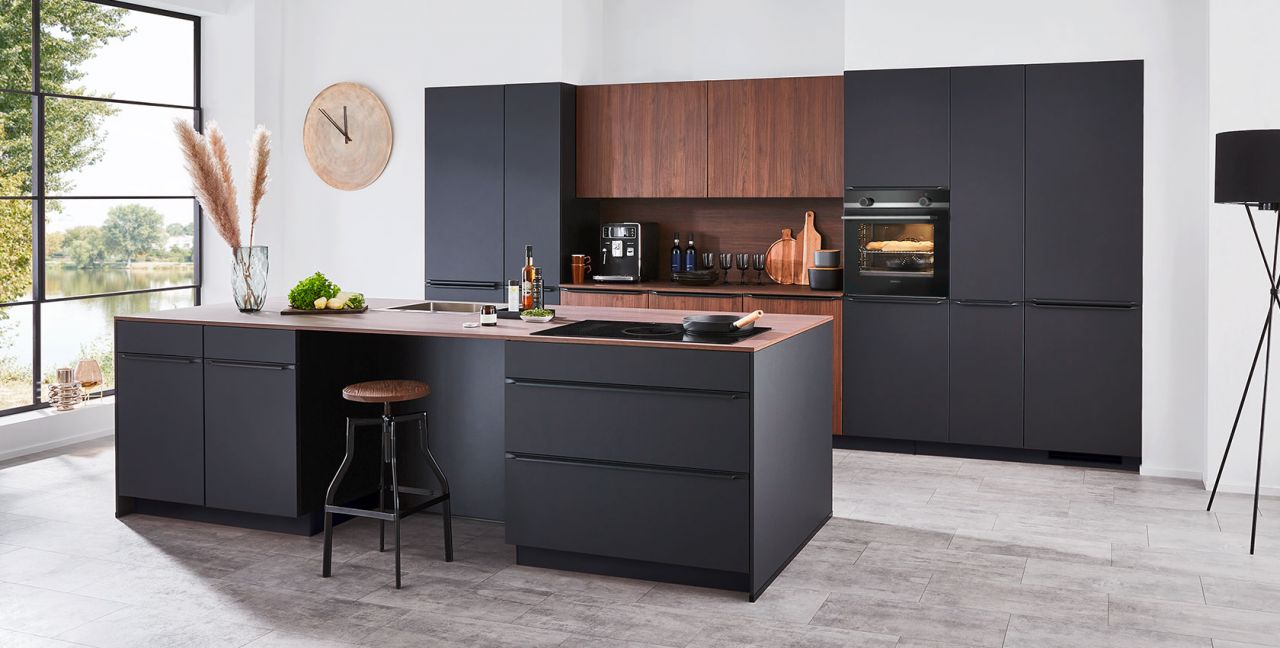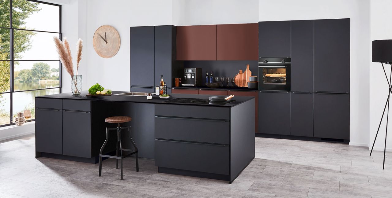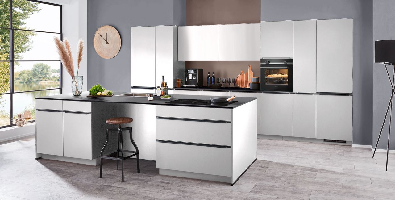 Inklusive Einbaubackofen Edelstahl Siemens HB510ABR1 Energieeffizienzklasse A, Glaskeramik Kochfeld mit Induktion und Kochfeldabzug (Umluft) Bora GP4U, Kühlschrank Junker JC30KCSE0 Energieeffizienzklasse E, Einbauspüle Edelstahl Rodi BOX LUX 57, XL-Schränken, Unterschrank mit Frontauszügen, Esstheke.